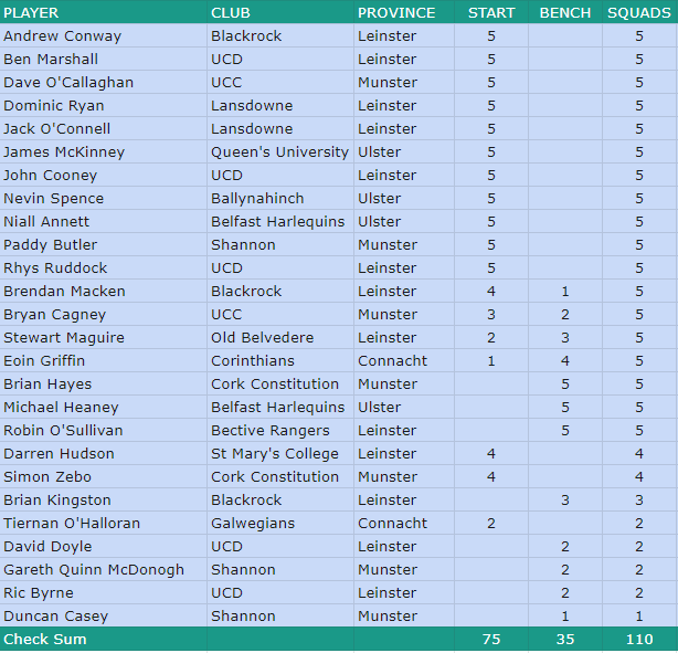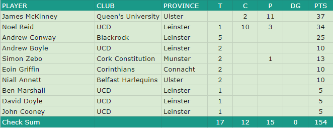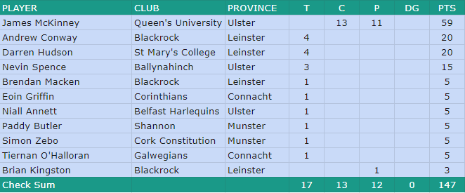 Ulster’s McKinney was the leading points scorer with the Queen’s out half having the main kicking duties. Leinster duo and topped the try scoring with four tries each over the five games.