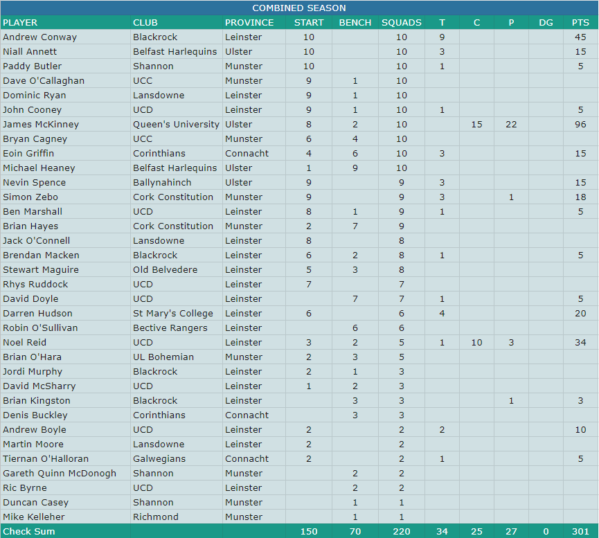 Unsurprisingly, McKinney ended the season as the leading scorer with 96 points from 15 conversions and 22 penalties and Conway was the leading try scorer with 9 tries over the 10 games.