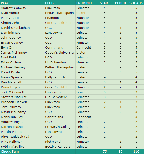 Head coach used 26 players over the Six Nations. This included four Ulster players in , , and all of whom appeared in all five squads throughout the tournament.