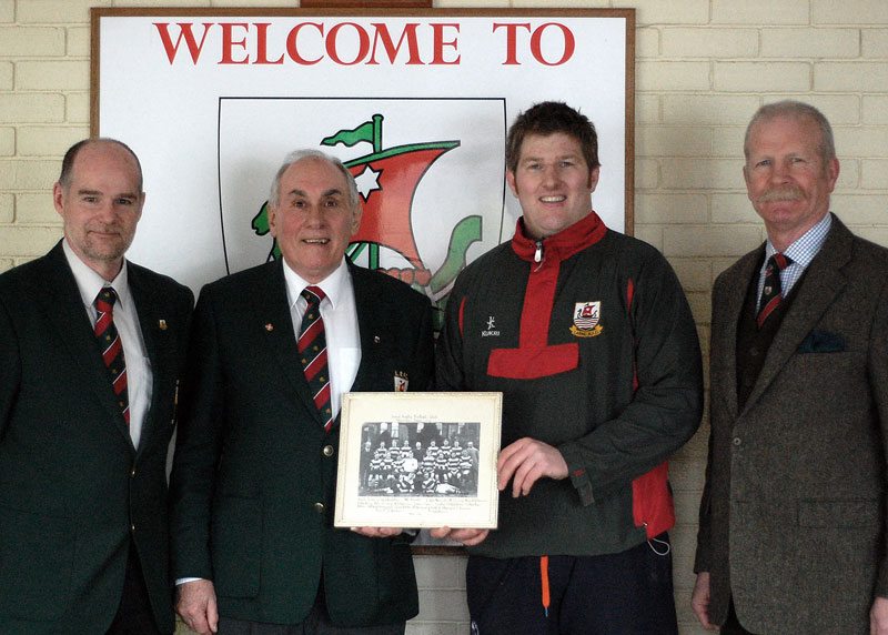 Larne Rugby Club members (l-r) Paul Montgomery, Arthur James, James McCluggage and William Nelson with a picture of the 1913 – 14 Larne Towns Cup winning team.