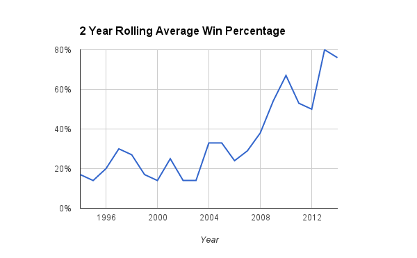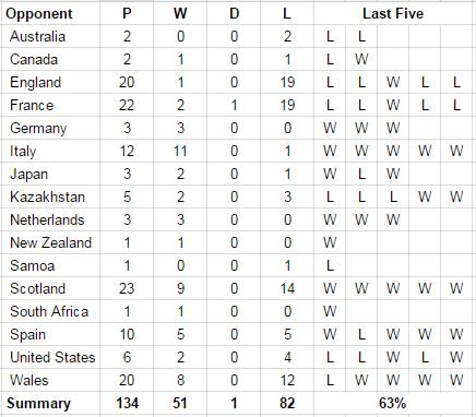 It is remarkable what such a small pool of players has achieved over he last two years, producing the two best runs in their history with seven straight wins in 2013/14, picking up the Grand Slam along the way and five straight wins in the build up to and participation in the World Cup pushing their 2 year win average up to unprecedented highs of 80% at the end of 2013 and 76% at the end of the World Cup though they should really get bonus ratings for that win against New Zealand!