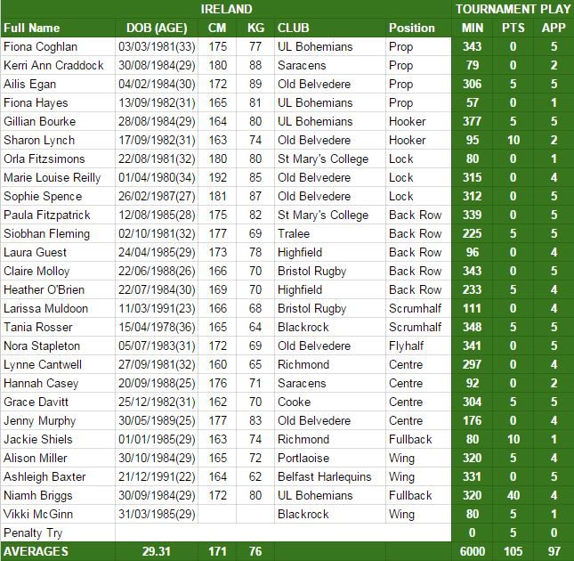The stats probably go a long way to pinpointing the reasons behind Ireland’s two losses in the final stages of the 2014 Women’s Rugby World Cup. Going into the final rounds Ireland had a core of 13 players who had been involved in the three pool games with three key players, Lynne Cantwell, Tania Rosser and Gill Bourke each totalling over 200 minutes on the pitch over 9 days, including two particularly brutal games against the USA and, of course, New Zealand.