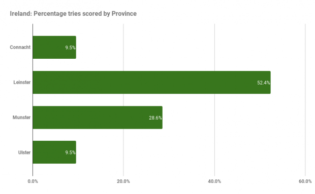 Leinster overperforms in terms of tries scored with Ulster and Connacht missing their quotas!