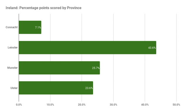 Breaking it down by province it doesn’t read too well for Ulster Rugby, who once again come up short in providing their full representation to the International side.