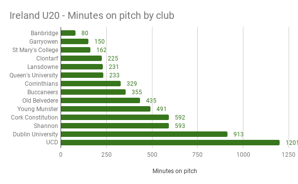 There were a total of 14 Clubs represented with UCD having the highest representation, with over 20% of the minutes on the pitch taken by UCD players.