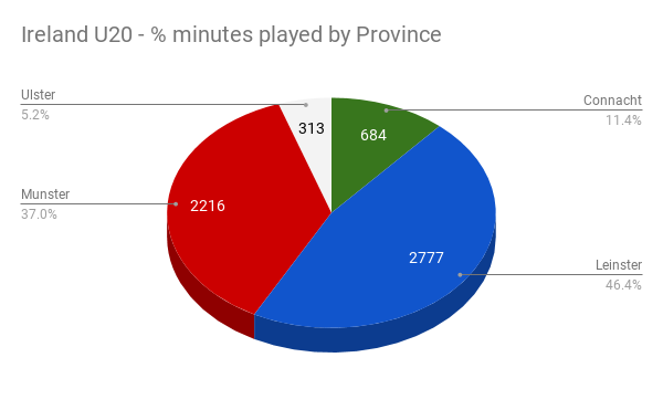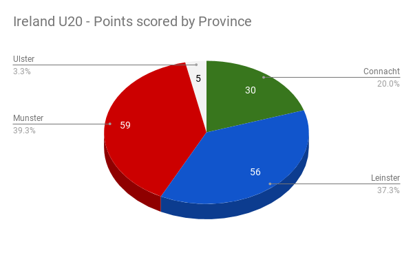 Putting the players into Provincial representation gives us Munster just edging out Leinster ahead of a healthy total from Connacht. Ulster looking somewhat lonely way in the back. 😥