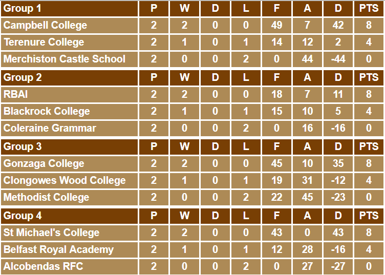Host’s Campbell College and local rivals Royal Belfast Academical Institution together with Dublin Schools Gonzaga College and St Michael’s College all progressed through Day 1 unbeaten, the group standings after the round robin fixtures as follows.