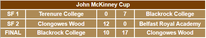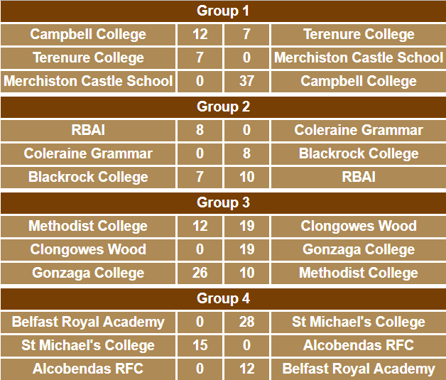 The Day 1 results pitched Belfast Royal Academy into the same play offs as Dublin Colleges Terenure and Blackrock alongside, the Co Kildare College, Clongowes Wood.