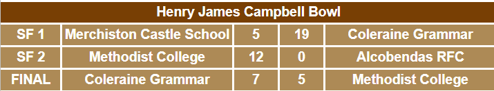 The two Ulster schools defeated Edinburgh’s Merchiston Castle and Spain’s Alcobendas, respectively, in the semi finals. The visiting sides met in a play off with Spain’s Alcobendas winning 10 – 5.