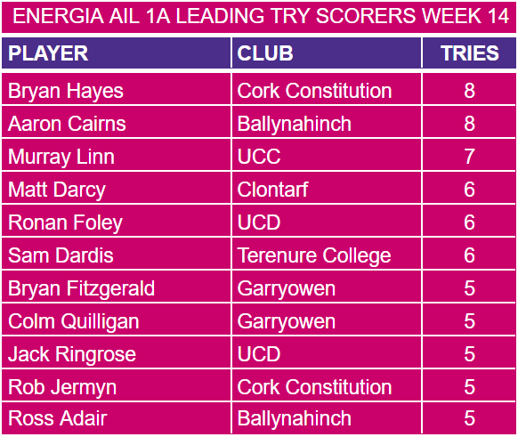JJ O’Neill (Cork Constitution) and Michael Courtney (Clontarf) were the leading scorers for the week with 10 points from 2 tries each. James Tarrant (UCD) was next highest with seven points from two conversions and one penalty.