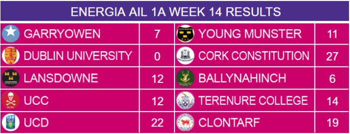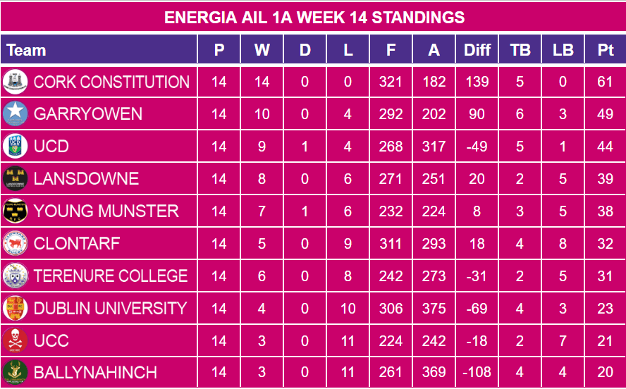 There wasn’t any movement on in the league table from Week 13 to Week 14 though Cork Constitution extended their lead at the top from 8 to 12 points.