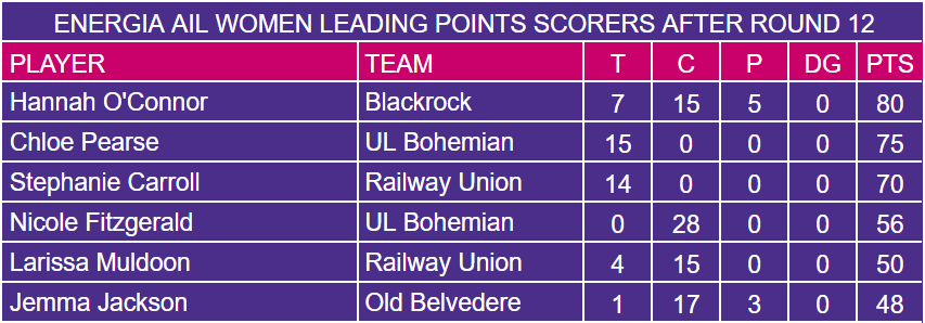 The three matches added another 145 points to the Week 10 and Week 12 totals with UL Bohs accounting for 78% of the points scored. The points came from 24 tries, 11 conversions (46% conversion rate) and 1 penalty.