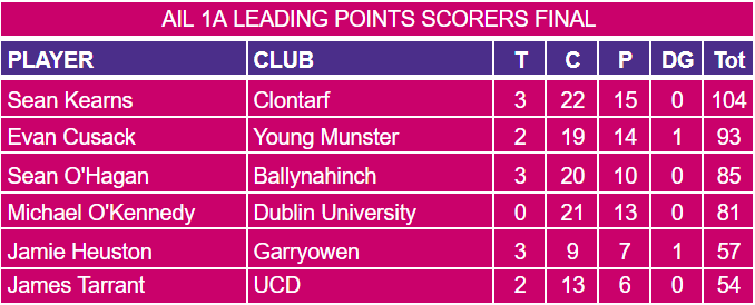 Of note are Clontarf’s and Dublin University scoring rates as they joined Cork Con with over 300 points for the season and Young Munster’s Evan Cusack certainly deserves a mention as the man behind their 85% try conversion rate.