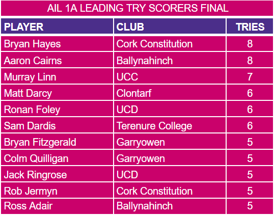 We don’t know who, if any would have made a late move but the 2020 AIL 1A Leading Try Scorer ended up being shared between Ballynahinch’s Aaron Cairns and Cork Constitutions Bryan Hayes who both bagged 8 tries each over the 14 games played.