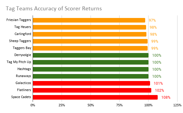 There were some minor discrepancies in the scorer returns from some of the teams. Congratulations to Derryvolgie, Tag My Pitch Up, HashTags and Runaways for matching the posted scores 100%. Those in Orange underreported and those in red overreported.