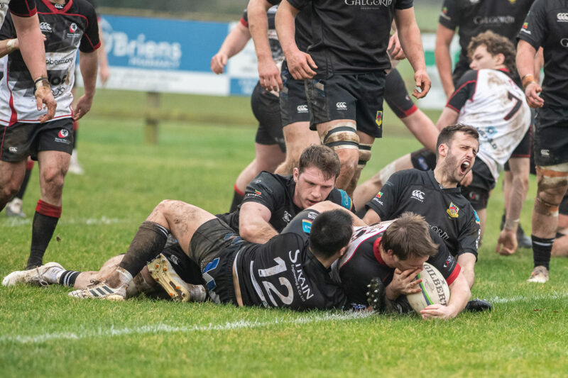 Ouch! Ballymena’s Tim Small gets injured as Rainey’s Damien McMurray crashes over for the game’s only try.