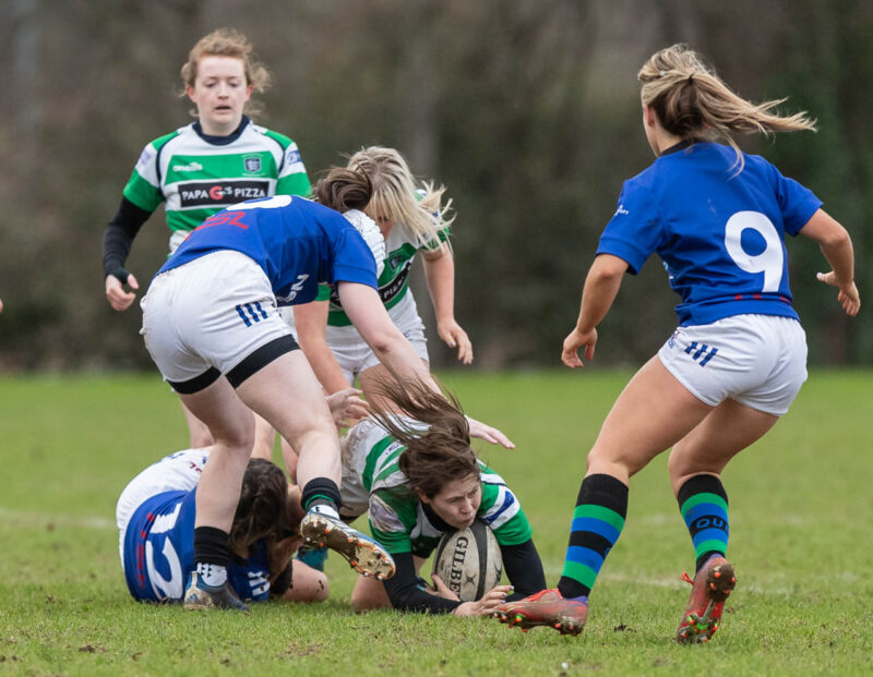 Despite territory it was on 15 minutes later, after 23 minutes, before Queens scored again, this time a close range try from Ciara Grogan, converted by Buller, to move their lead on to 12-0.