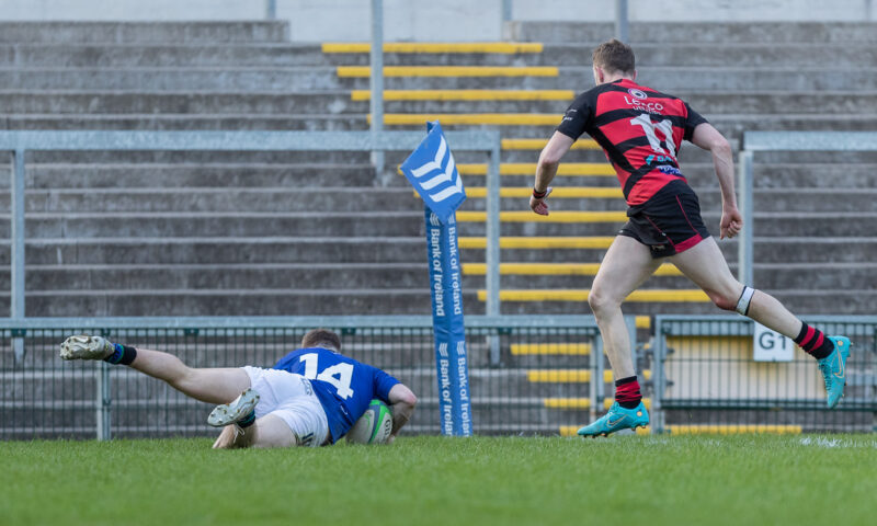 Both sides were adventurous in the first minutes with searing breaks stopped by scrambling defences. Play moved between the 22s, with both sides keen to move the ball along the backs. The deadlock was broken on 18 minutes when Queens’ Conor McKee found a gap to get over for a try converted by Ritchie McMaster for a 7-0 lead.