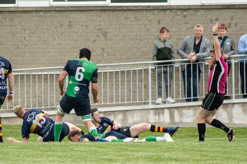 A high scoring match in Ballynahinch today with the home side in dominant form. An early Zac Ward try attempt was disallowed before scrum half Ruairi Meharg crossed near the posts, injuring himself in the process, No 12 Mark Best converted to take the score to 7 – 0.
