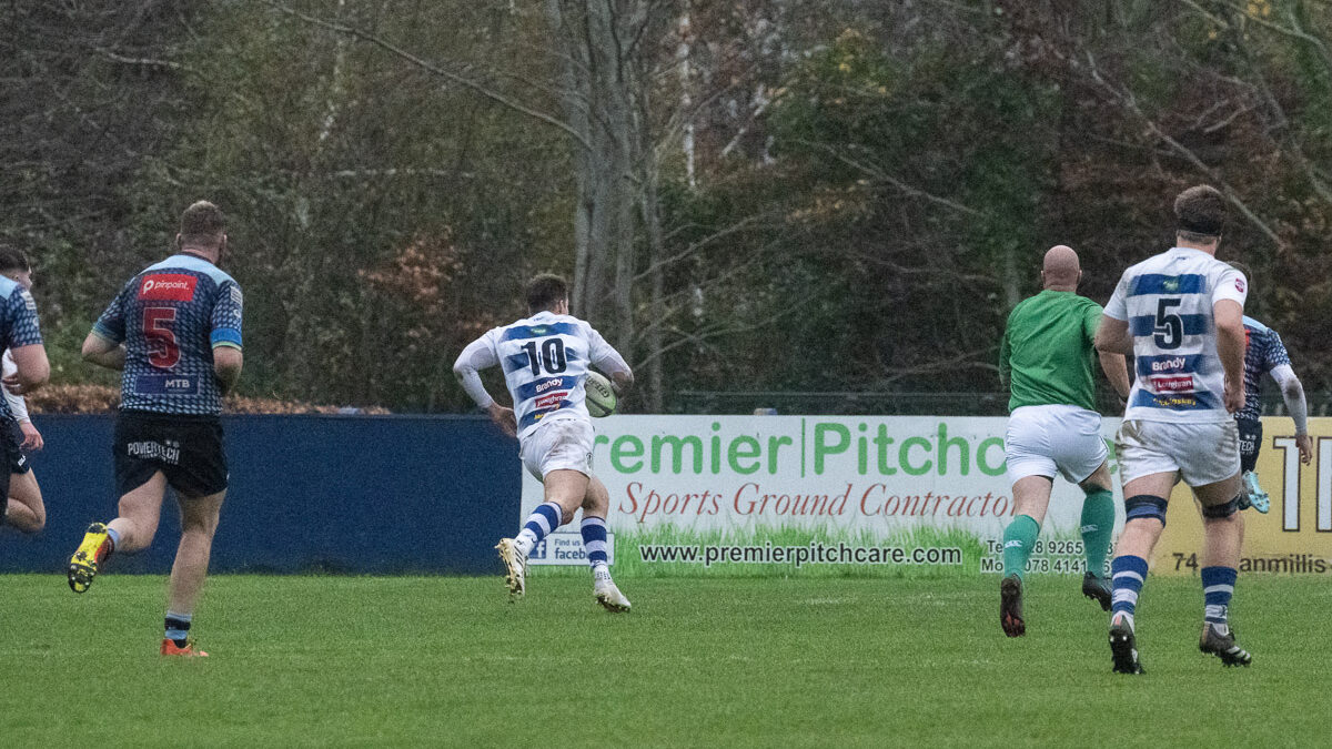 A gruelling forward battle kept things stalemated until a kick ahead by the visitors was caught by the wind, wrong footing the home defence and Andrew McGregor latched on for an unconverted try to put Dungannon ahead 3 – 5 at the interval.
