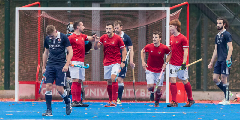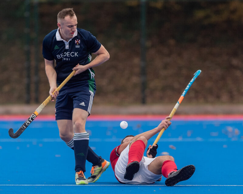 The weather, on Saturday afternoon hadn’t improved for the Men’s All Ireland League fixture, between Queens & Corinthian, but, at least, the lights were on! I had been warned that this might be a feisty confrontation and it wasn’t wrong!