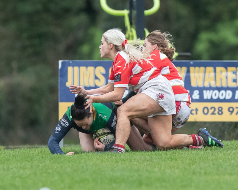 Ballynahinch eventually started to get on top and laid siege to the Randalstown line for 10 minutes. Having sucked in the defence, the ball was released to the backs for Rachel Morton to go over midway out for a try and a 5 – 0 lead after 25 minutes.