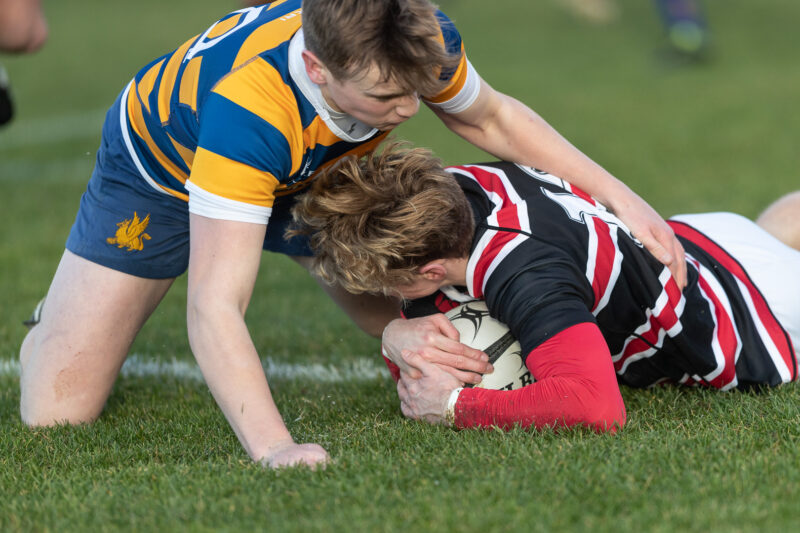 I arrived at Bangor Grammar School shortly after 9.00am, for the Schools Cup Group B game against visitors, Banbridge Academy. It was cold, wolves howled & a polar bear wandered across the halfway line! However, by 10.30 am, with a low sun beating down, the pitch was ‘taking a stud’.