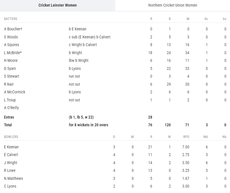 The tone was set for the Leinster innings with opener Ally Bouchert bowled first ball by Evie Keenan. Lara McBride was the highest Leinster scorer with 18 runs as NCU bowled aggressively, Emma Calvert having impressive figures picking up two wickets in her four overs for a meagre 11 runs.