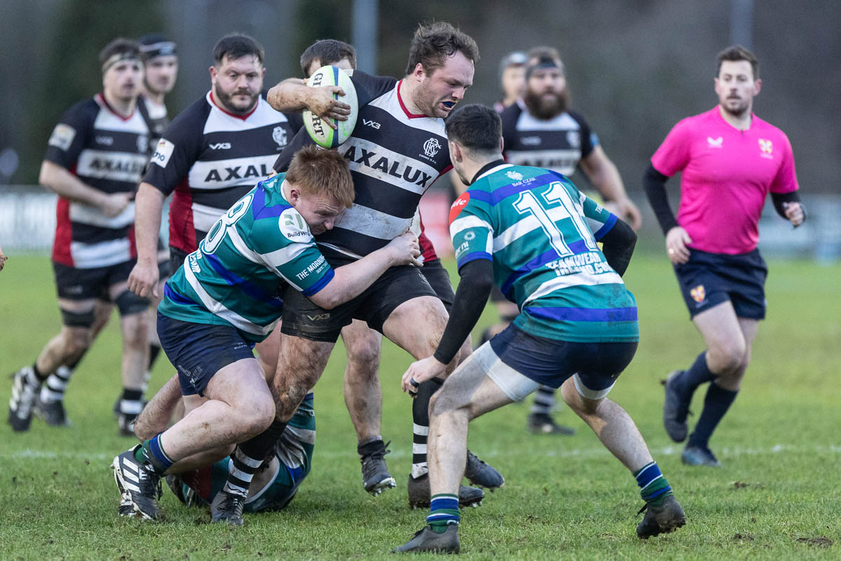 Eventually Grosvenor put together a back movement. Jamie McNeight showed a clean pair of heels to the Cooke defence to score midway out on the right. Cameron Knell judged the wind to send over the conversion for Grosvenor to lead 7-5 . . .