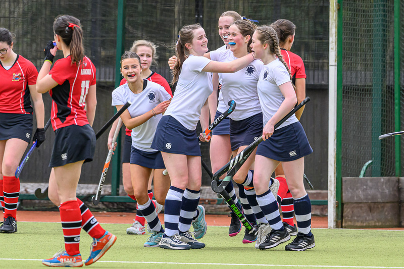 Methody players congratulate Leila Tindall after scoring.