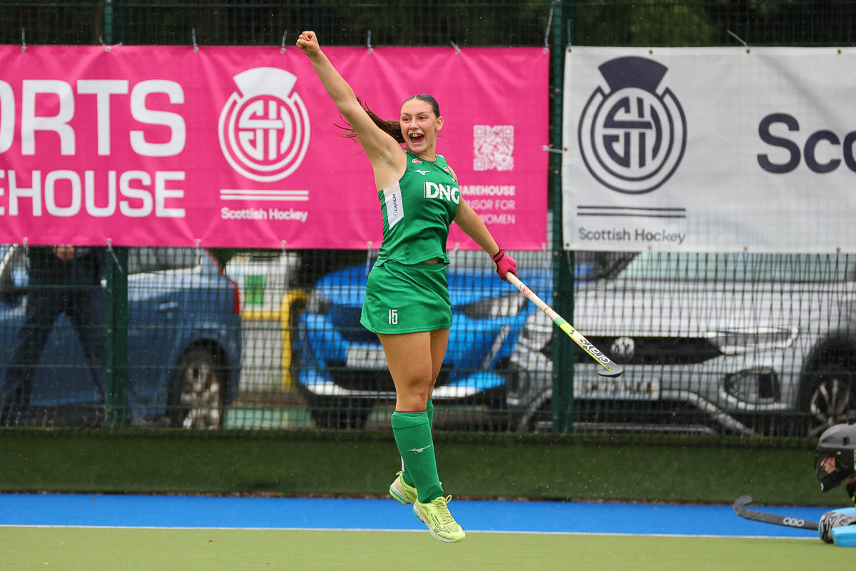 Rebekah Lennon celebrates her goal for Ireland in the Final of the 2025 Girls EuroHockey U18 Championship II against Scotland at the Glasgow National Hockey Centre on Saturday 19th July 2025