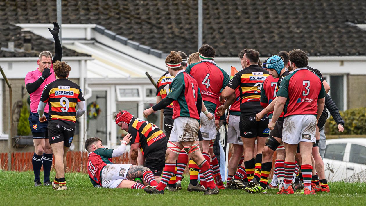 Lurgan were soon back in the hunt with their Captain, Angus Cunningham going over after some fine forward rucking to reduce the deficit to 5 . . .
